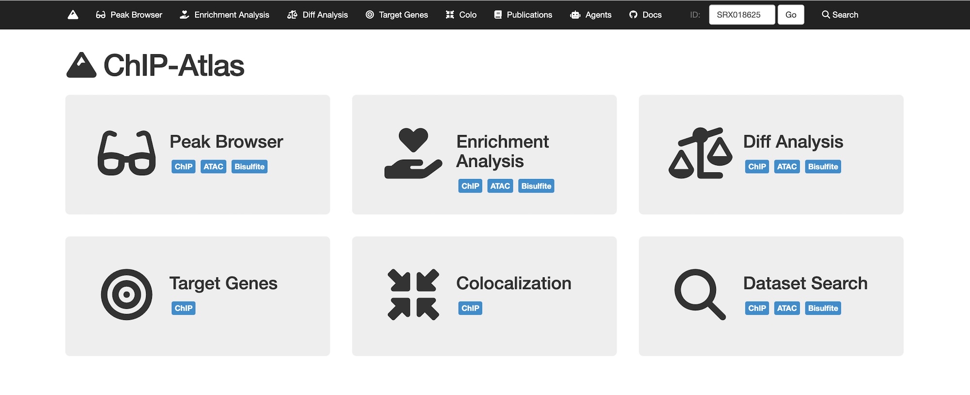 - 2022-03-25鄒 兆南さん、沖 真弥さんによる、ChIP-Atlas アップデート論文が Nucleic Acids Research 誌に公開されました。これにより、ChIP-seq データだけでなく、ATAC-seq と Bisulfite-seq などのエピゲノムデータも利活用できるようになりました。本研究にご尽力くださった DBCLS の大田達郎さんと九州大学の三浦史仁先生に深く感謝します。🔗ChIP-Atlas